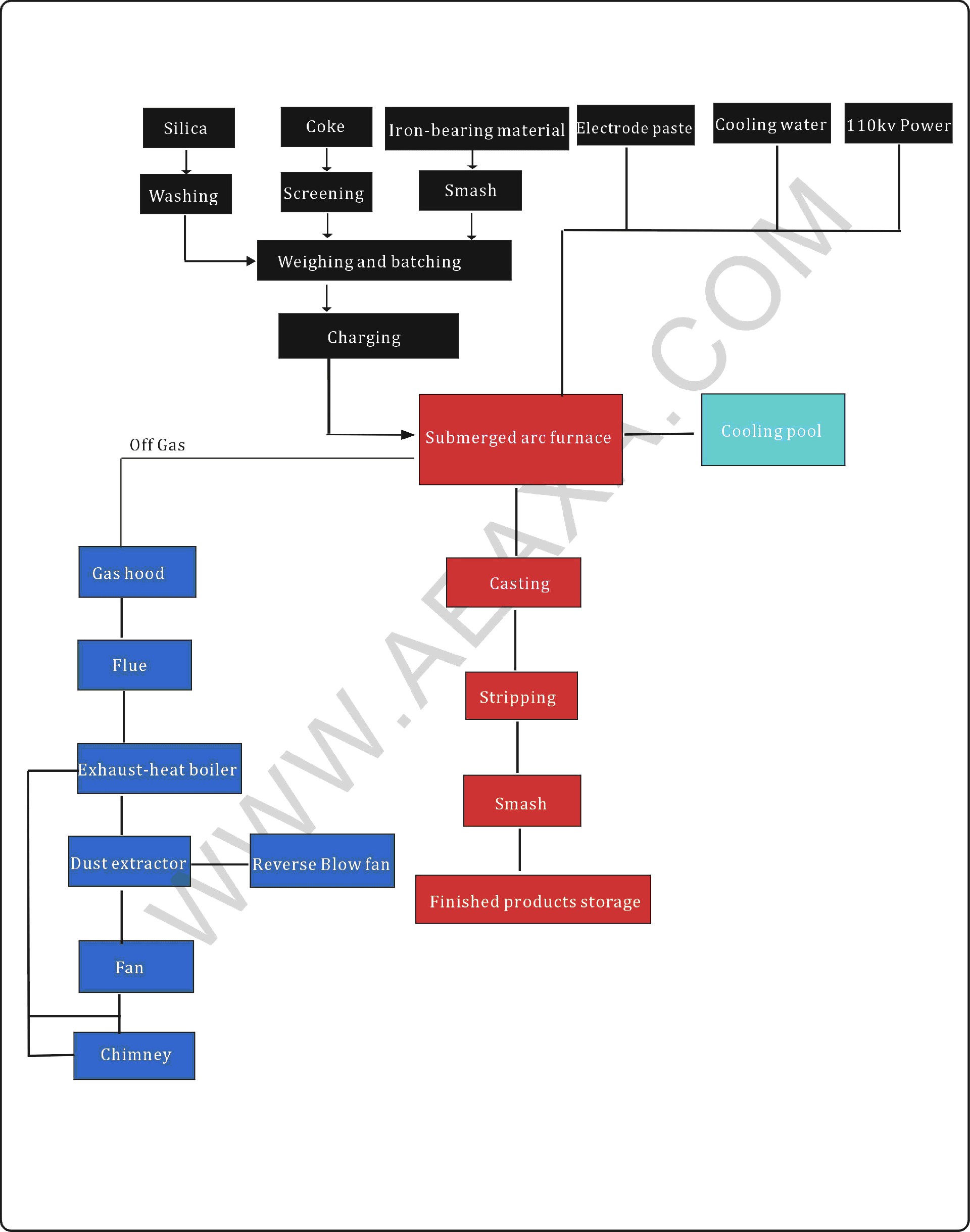 Ferrosilicon production processIn the production of ferroalloy, mostly rely on metal oxides ore reduction. This reduction need under higher temperature conditions, and consumes a lot of energy to achieve. As major equipment for of ferroalloy production, electric furnace must be efficient, energy-saving, has high utilization rate and etc.